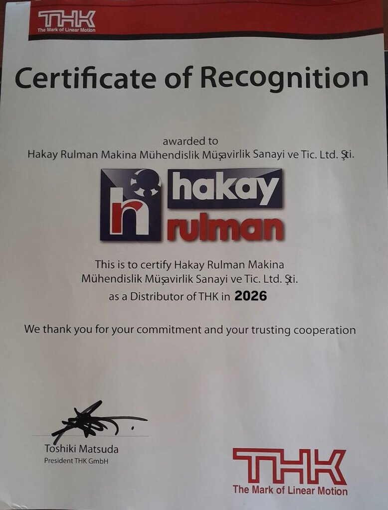 2026 yılında yenilenen THK Lineer Sistemler Distribütörlük ve Başarı Belgemiz. İzleyiniz